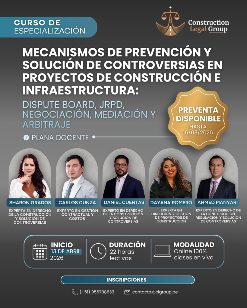 Este curso abordará los aspectos clave, tipologías y complejidades de los reclamos en contratos de construcción, brindando a los participantes herramientas prácticas y conceptuales para gestionarlos de manera correcta y eficiente. El programa se desarrollará con base en los marcos contractuales más relevantes: los contratos FIDIC (Rojo, Amarillo y Plata – Rainbow Suite 2017), el contrato NEC4 ECC (opciones A y C) y las disposiciones de la nueva Ley General de Contrataciones Públicas (Ley N° 32069) y su reglamento.